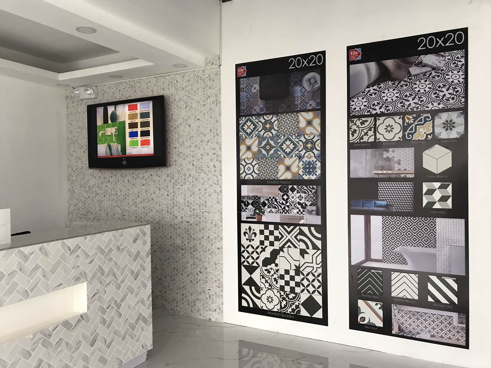 The Cashier area featuring Carara signature mosaics, and our newest series of Spanish design tiles